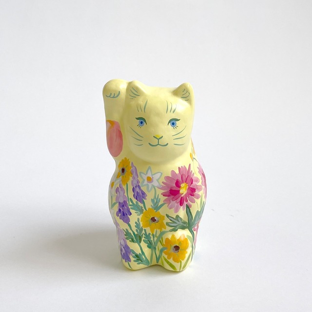 柔らかなイエローの体に、春の庭を詰め込んだような招き猫「HARU」。 下絵なしの即興で描かれる花々は、二度と同じものは描けない一期一会のデザインです。 瑞々しい植物のエネルギーをまとった姿は、眺めるたびに心が上向くような軽やかさ。穏やかな福を呼び込んでくれます。 【サイズ】 幅6cm×奥行き6cm×高さ11cm 張子にアクリルガッシュ、バーニッシュ