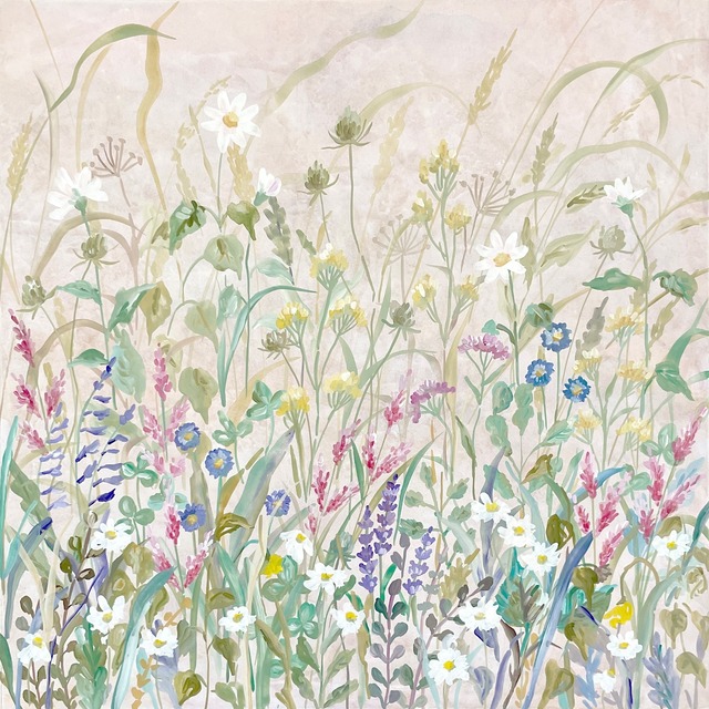 普段はしっかり下絵を描いてから着色する手法をとっていますが、「思いのままに筆を動かし、自由に絵を描くとどうなる…?」という興味から描いた本作です。 私が好んで歩く河川敷の風景、風にそよぐ草花を思い浮かべながら描きました。 2025年制作 紙、アクリルガッシュ 額縁外寸/365×365(㎜) 作品サイズ/220×220(㎜)