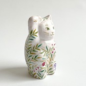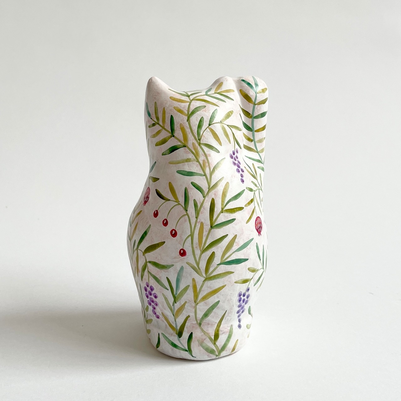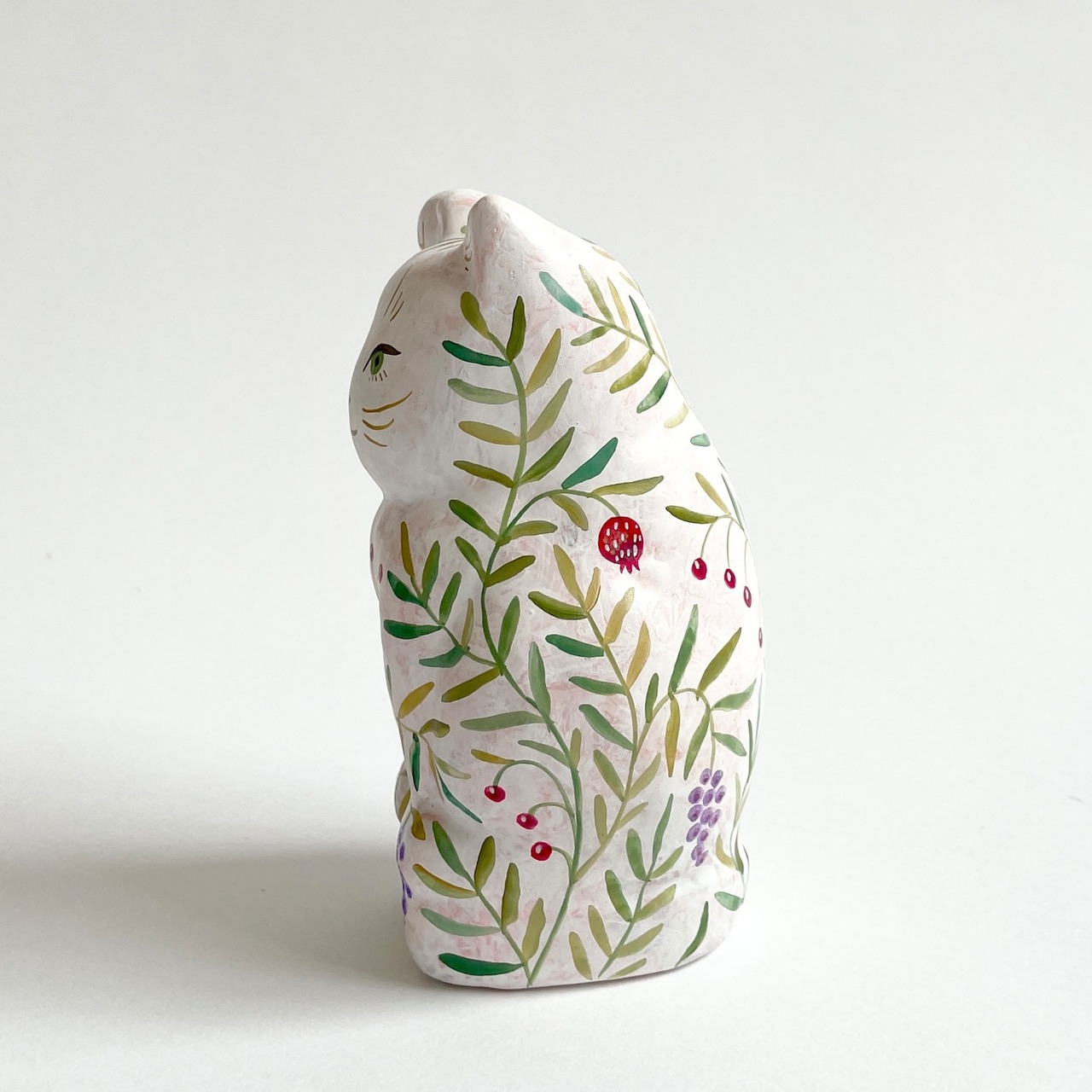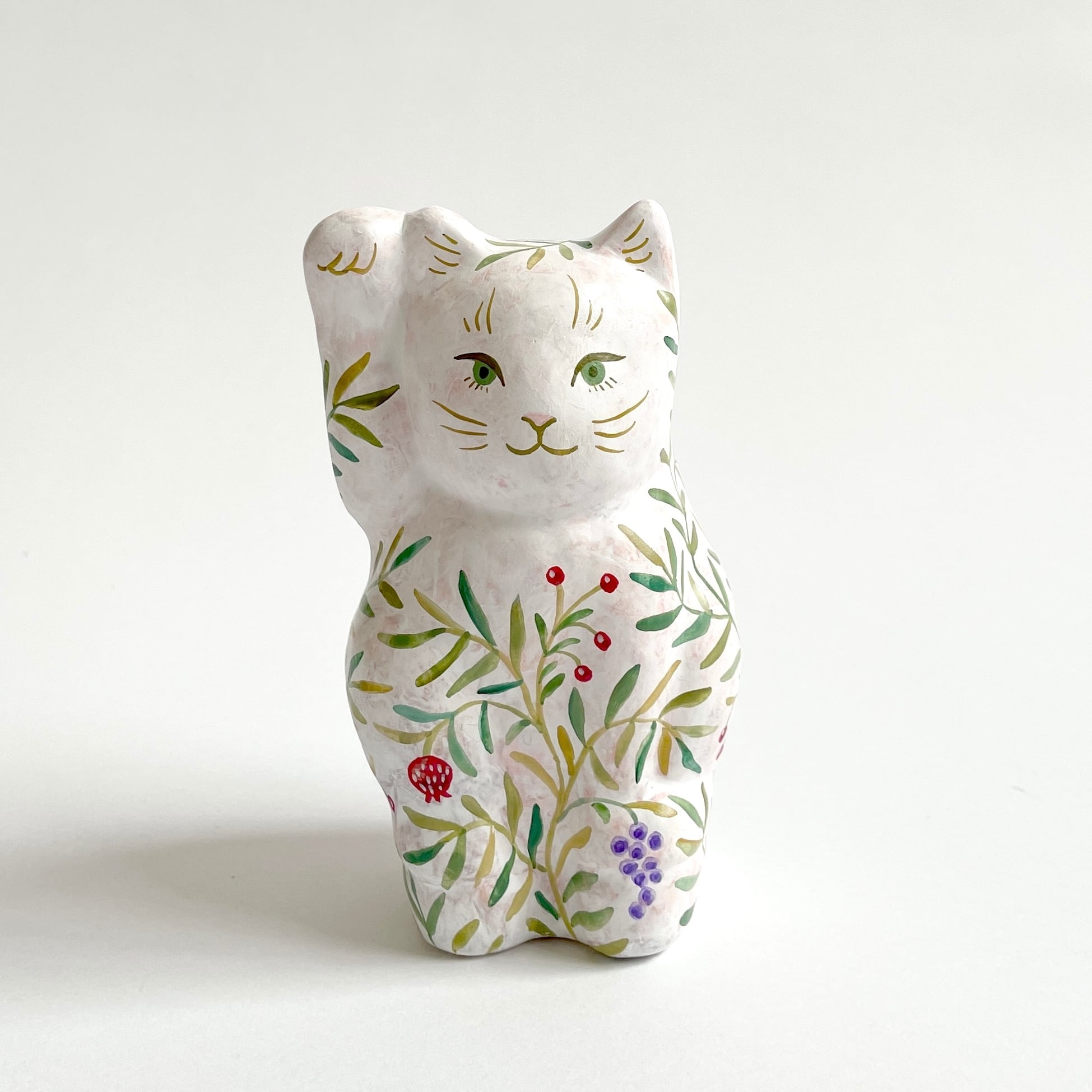 手のひらサイズのハリコの招き猫。白猫を彩るザクロやブドウなどの実りは、豊かな収穫の象徴。満ちる果実の絵柄とやわらかな表情が、暮らしに実りある運気を呼び込みます。