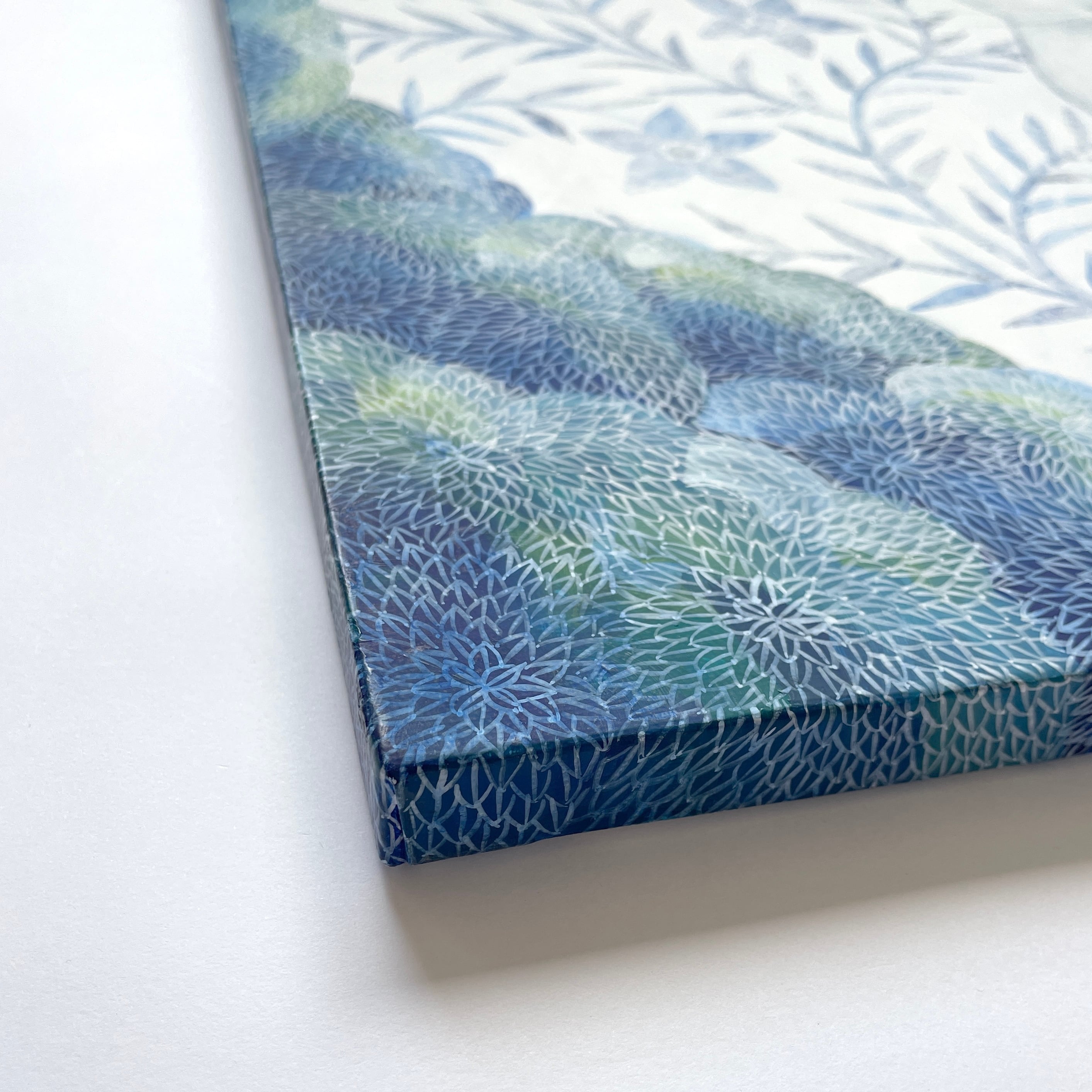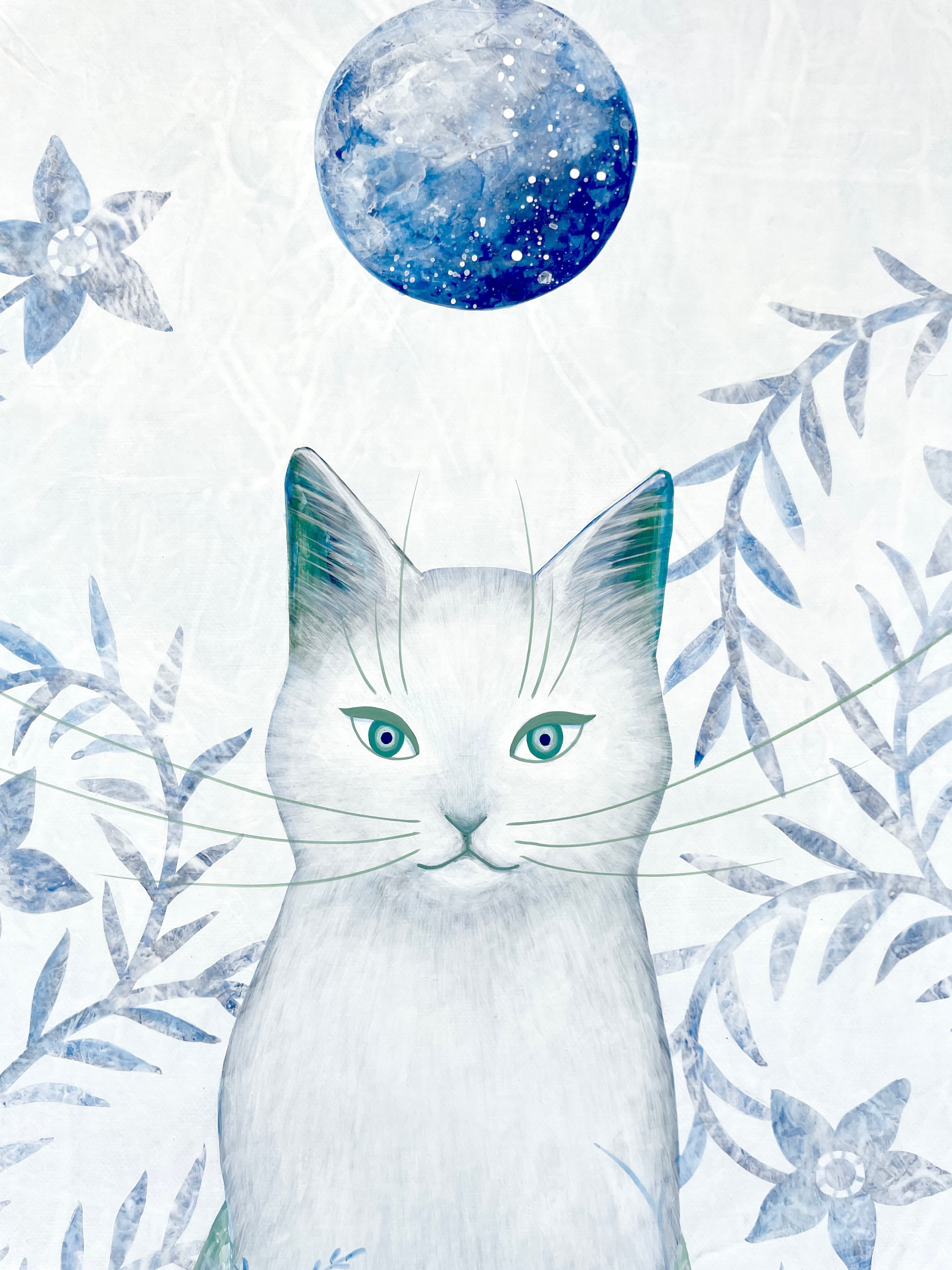 深く青い色彩と、光り輝く月が織りなすコントラストは、見る人の心を深い安らぎへと誘います。自分を大切にする時間、あるいは大切な場所を見守るお守りのような一枚として、お部屋に飾っていただければ幸いです。