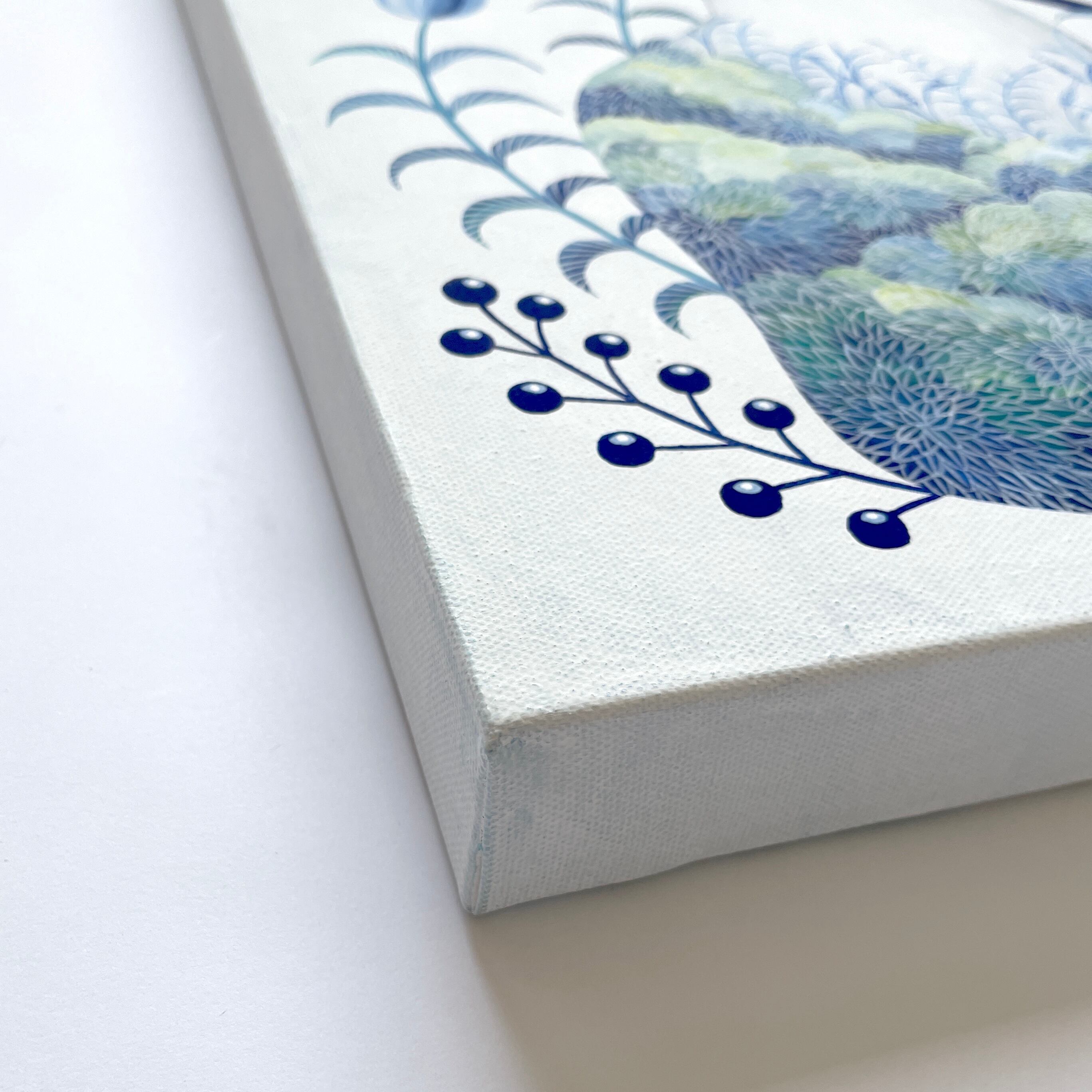 深いブルーの濃淡と繊細なラインで、幻想的な庭のひとときを描きました。