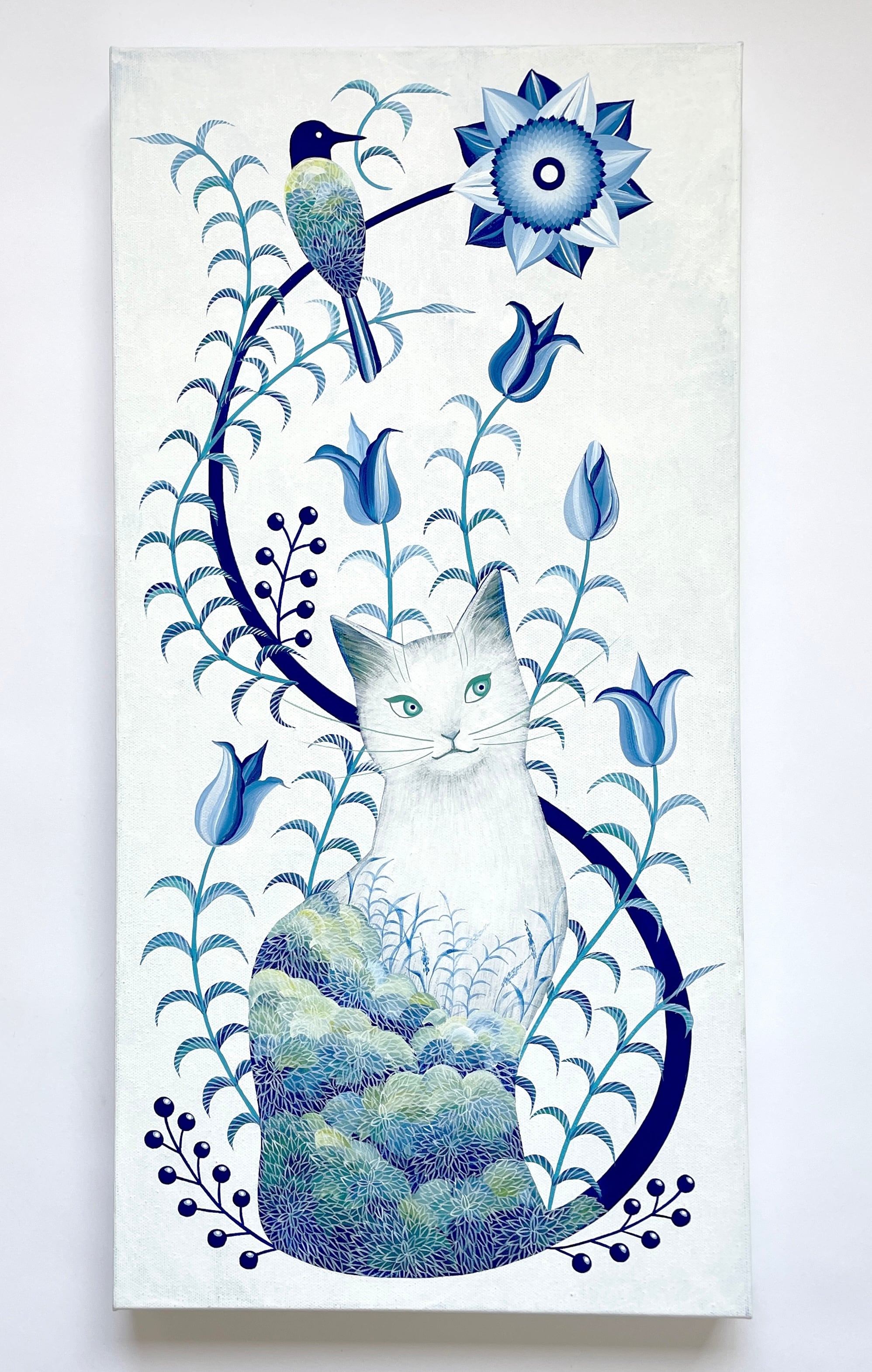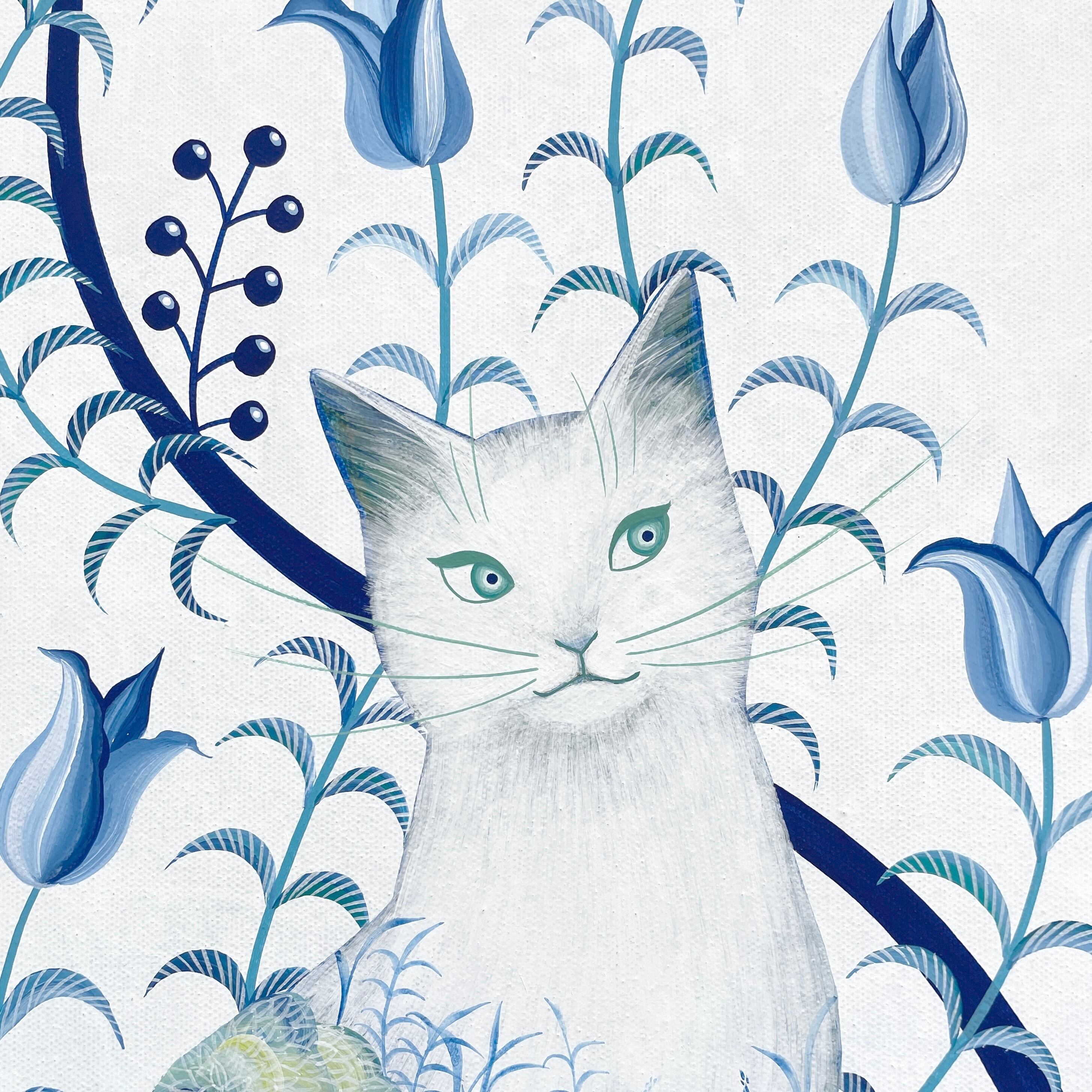 猫の体に溶け込むように描かれた植物の文様は、命の循環や自然との一体感を象徴しています。