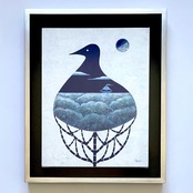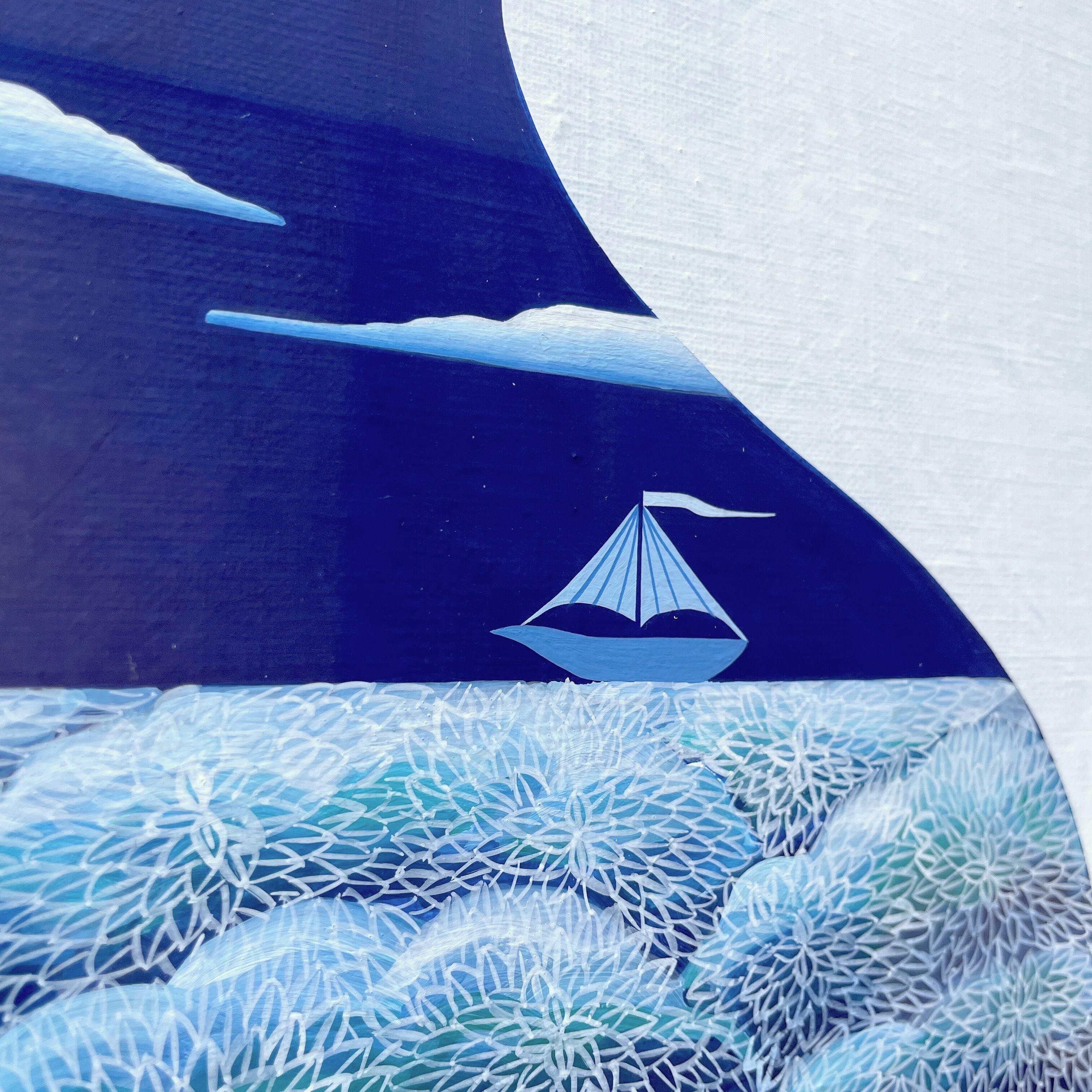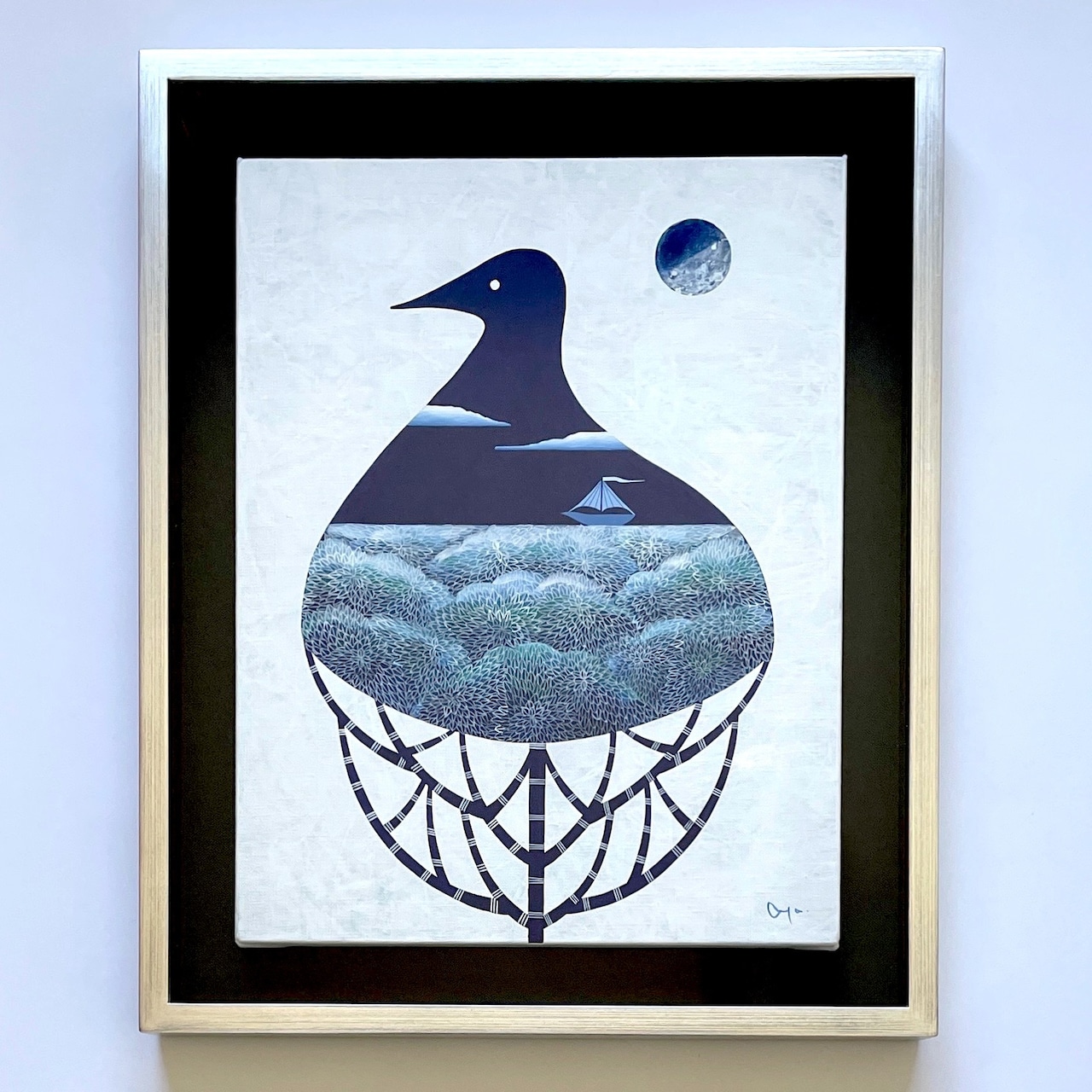 鳥と一体になっている木を海に見立て、船を浮かべました。月明かりを頼りに静かな夜の海をゆく船は、どこに向かっているのでしょう。