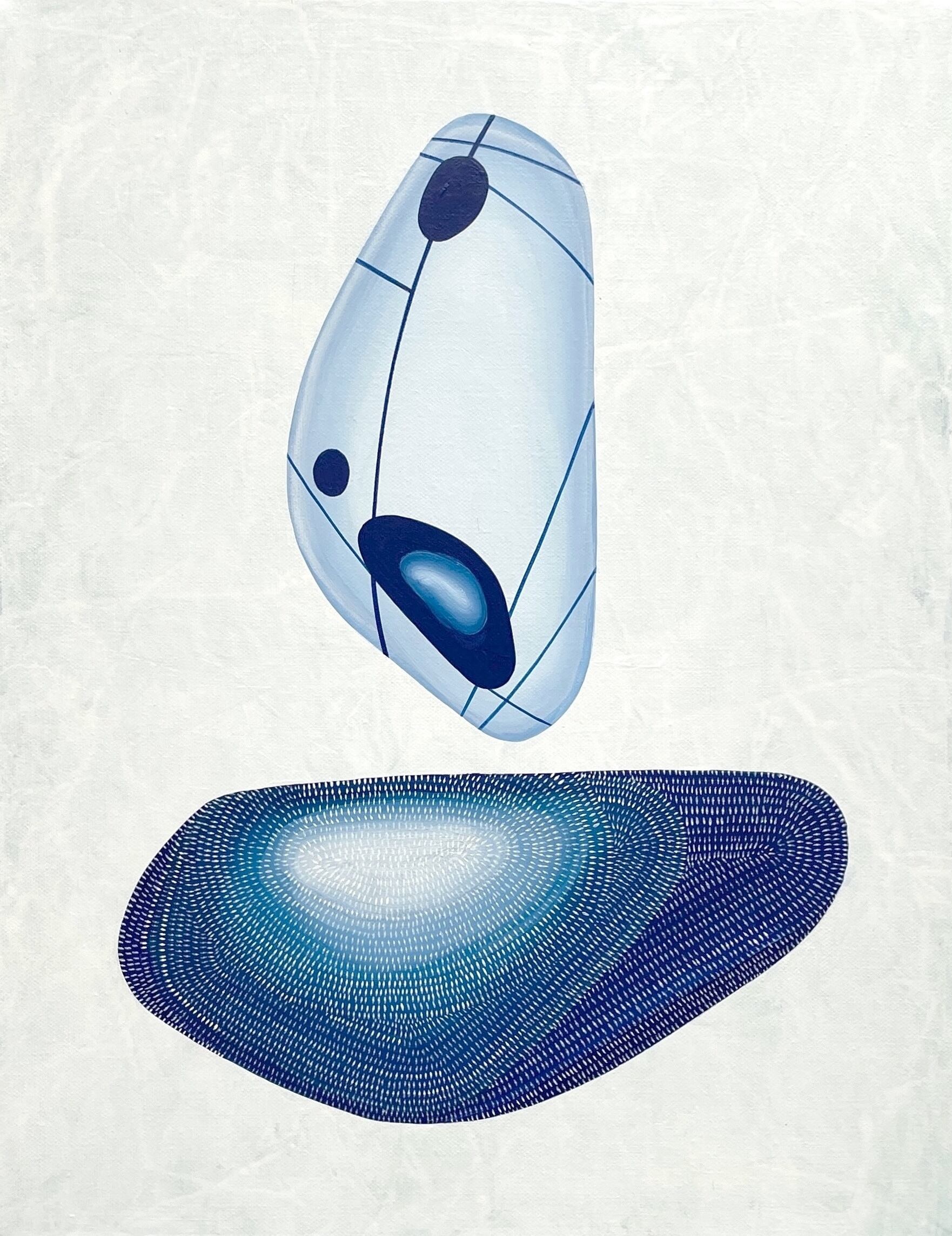 関口の代表作「青のシリーズ」の中の「石のシリーズ」の一点。本作では、より抽象度を高めた挑戦的なアプローチを取り、表現の境界を広げました。石という存在を通して感じる宇宙の広がりを捉えています。この世界観の根源にあるのは、無数の石の中で巡り合う「偶然」や「縁」という奇跡的な出会いです。