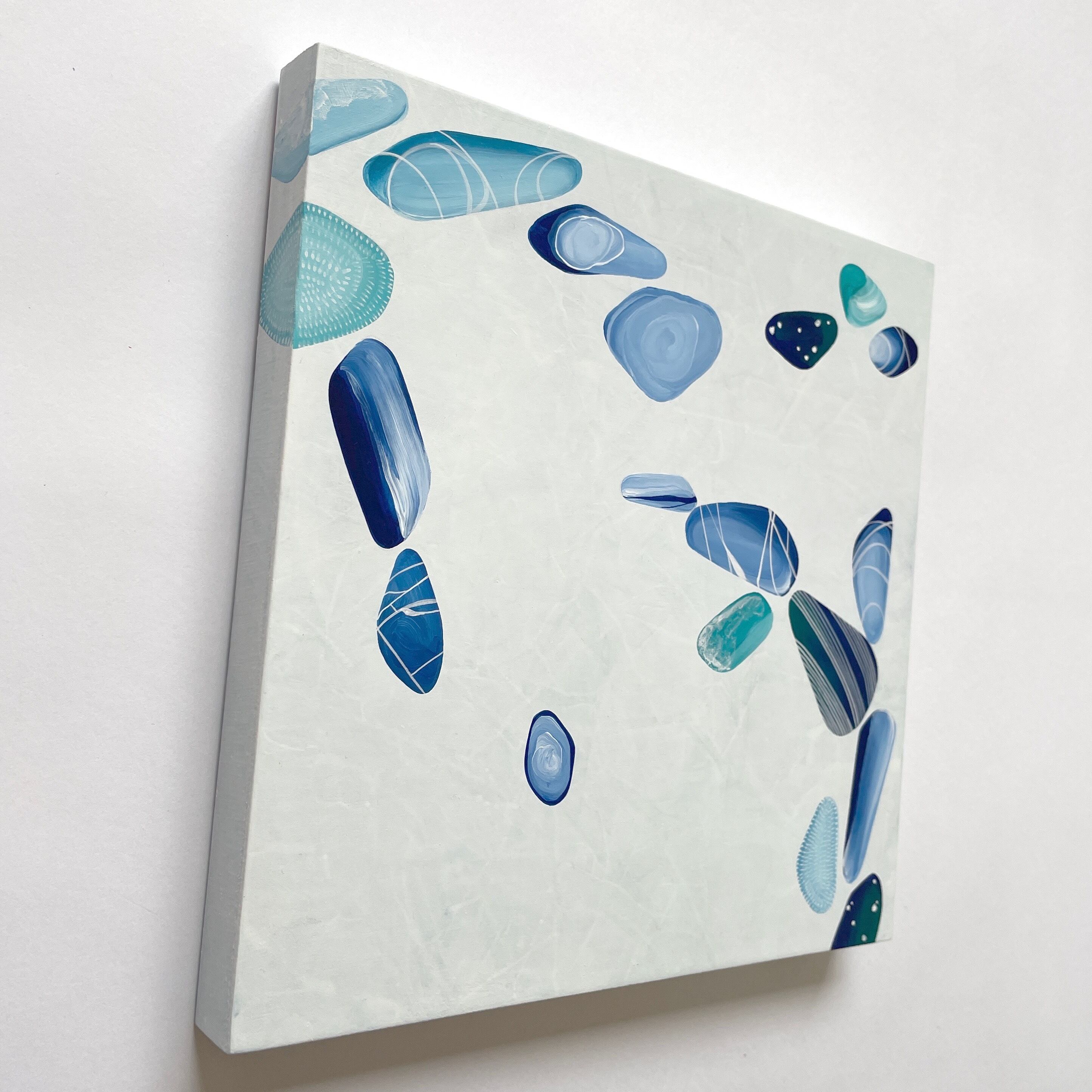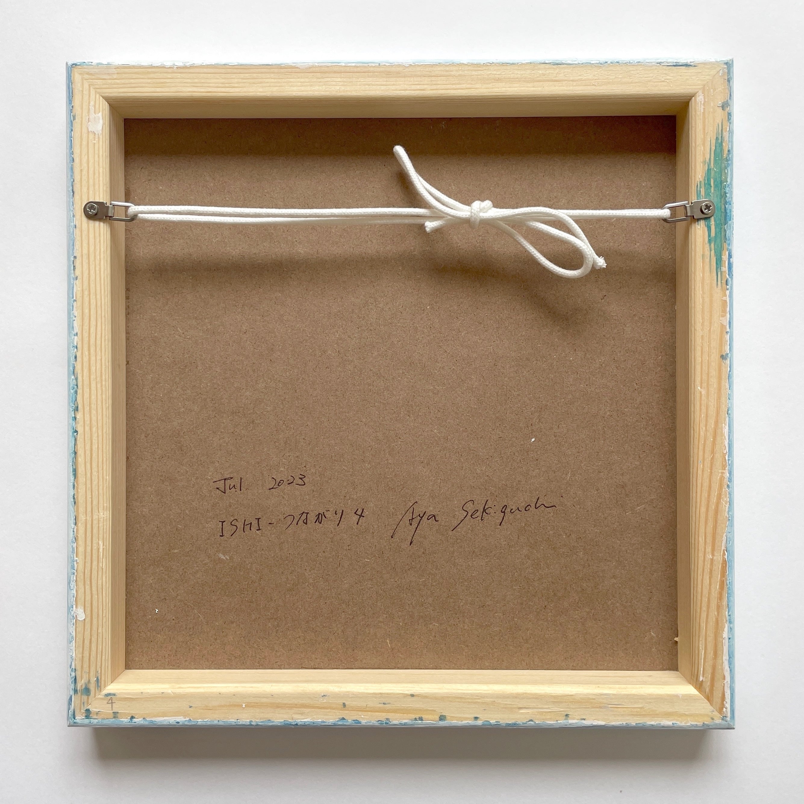 15枚揃うとひとつの作品になる連作「つながり」です。ひとつひとつのピースがそれぞれの場所に旅立ち、人々の縁や思いをつなぐことを想像しながら描きました。小さな石は私たち自身。豊かなつながりの世界を作品に込めています。