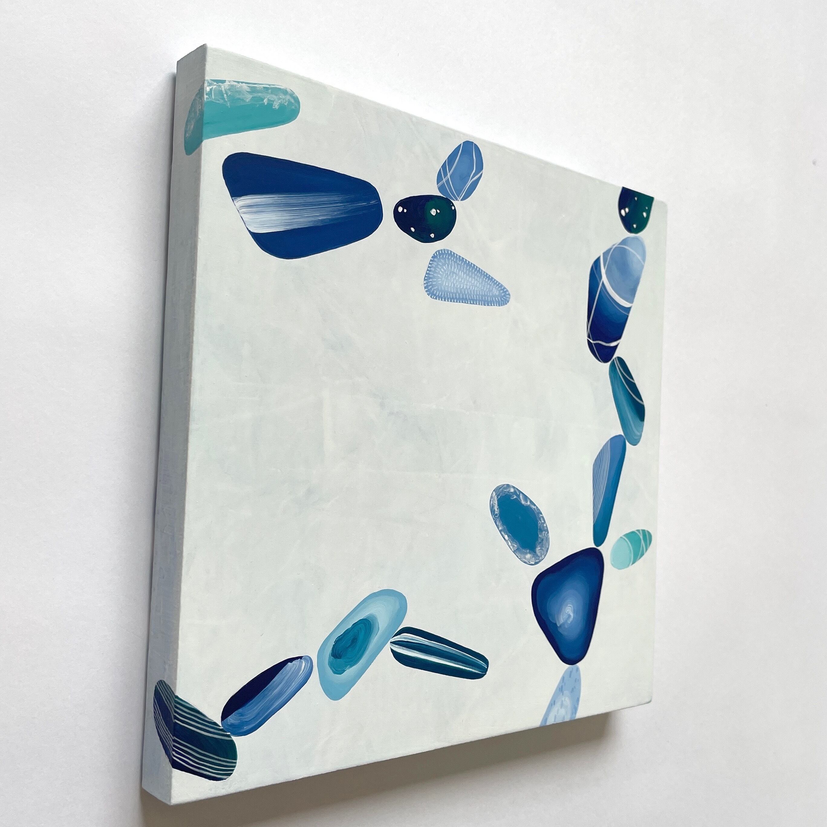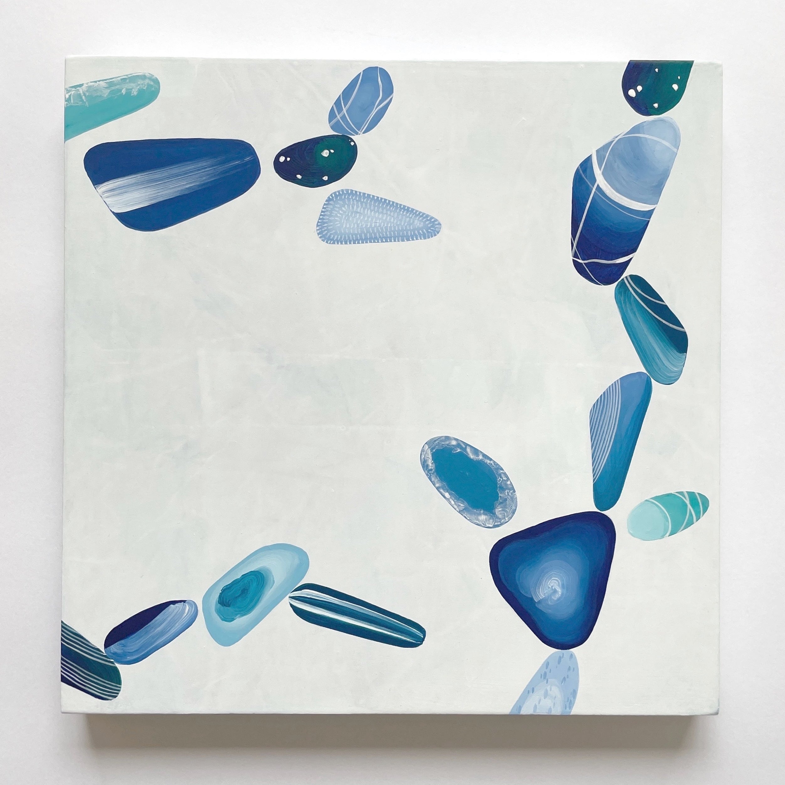 15枚揃うとひとつの作品になる連作「つながり」です。ひとつひとつのピースがそれぞれの場所に旅立ち、人々の縁や思いをつなぐことを想像しながら描きました。小さな石は私たち自身。豊かなつながりの世界を作品に込めています。