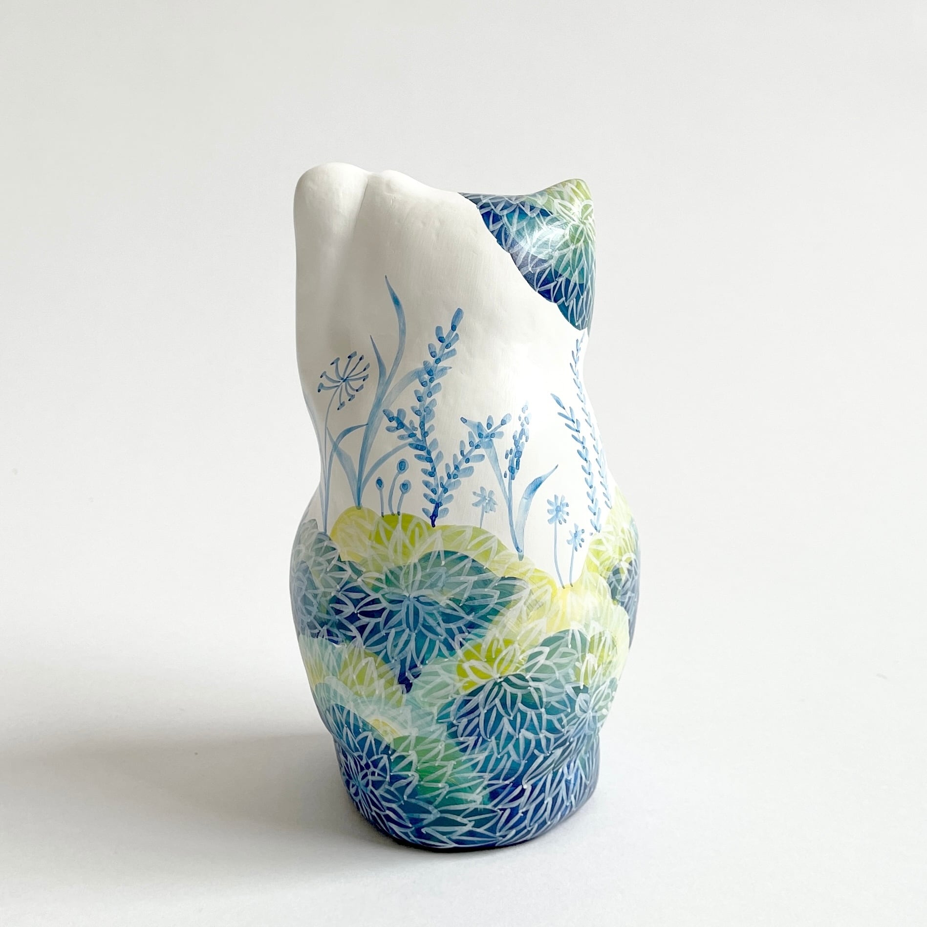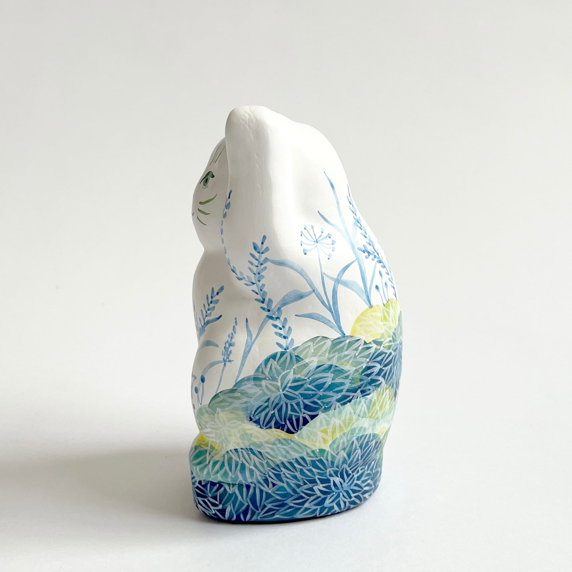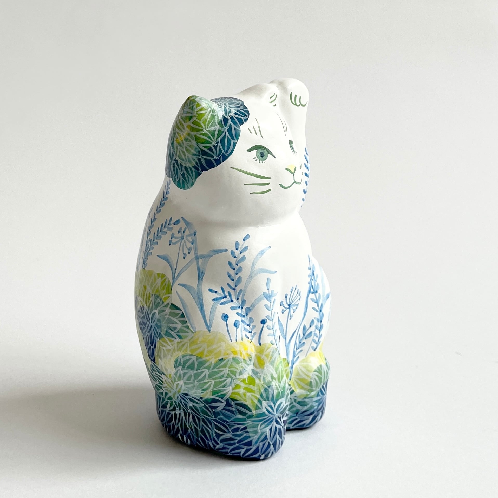 手のひらサイズのハリコの招き猫。植物がのびやかに育つ様子をイメージしました。若葉を思わせる柔らかな光をまとった瑞々しい佇まいで、軽やかな幸運を招き入れます。