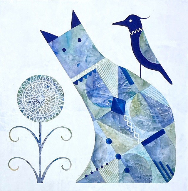 幾何学パターンで描かれた猫がポップで可愛らしいです。花を覗き込んでいるような様子に「花のかおり」と名付けました。 2024年制作 ケントボード、アクリルガッシュ 額縁外寸/365×365(㎜) 作品サイズ/220×220(㎜)